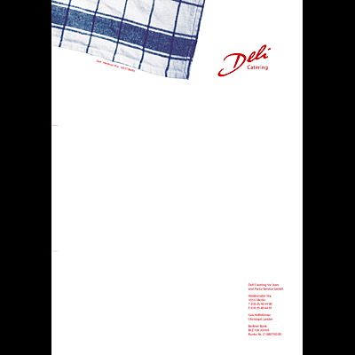 Logoentwicklung, Briefbogen, Visitenkarte, Leporello und Pressemappe für den Catering-Service Deli aus Berlin.